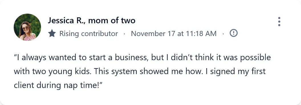 We have seen moms with no prior business experience launch their own agencies, sign clients, and create a meaningful income, all while working on their own terms. They are living proof that you don’t have to sacrifice your family for your financial goals. With hard work and a proven plan, you can achieve the life you want. This course will show you how.